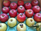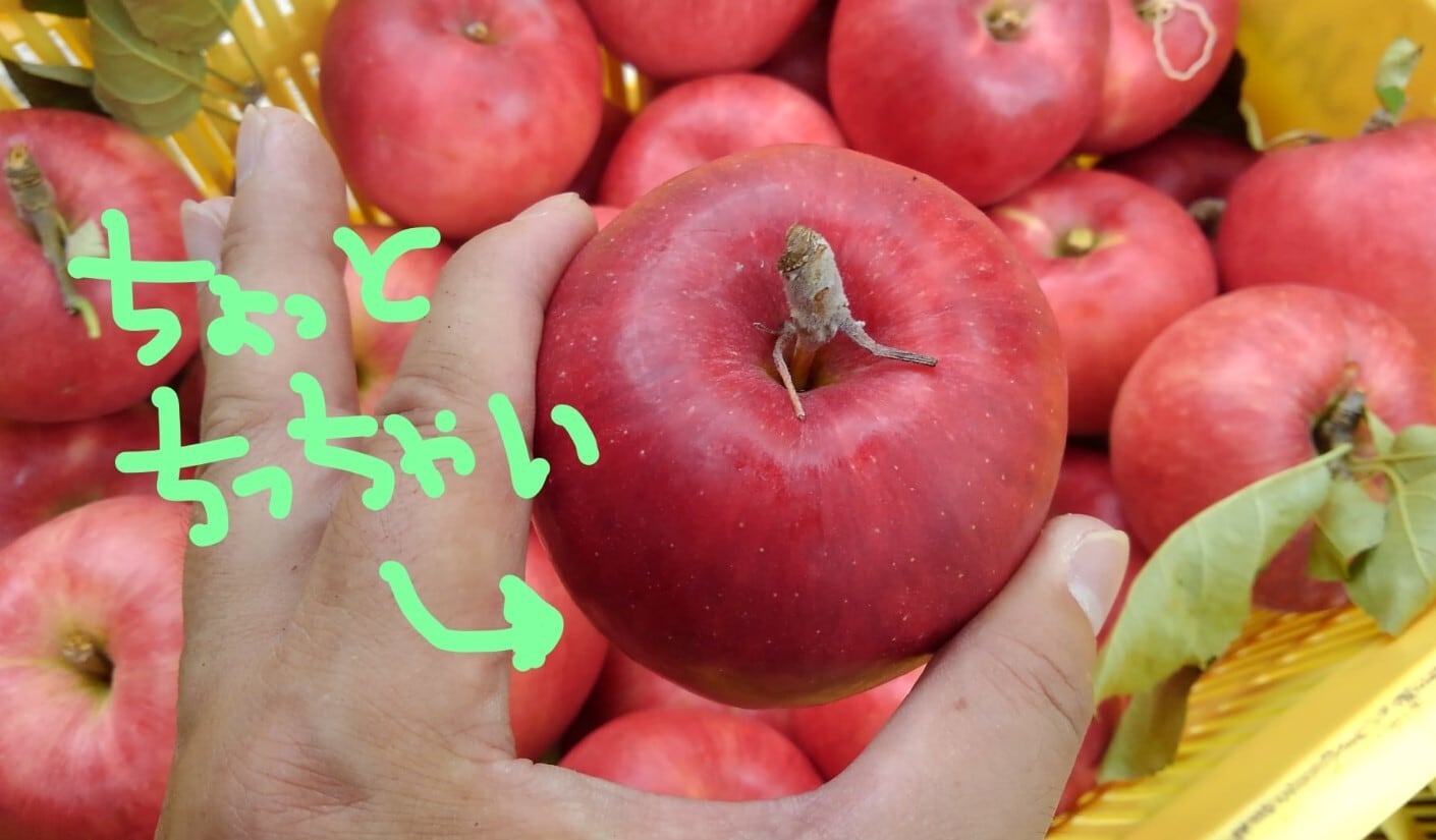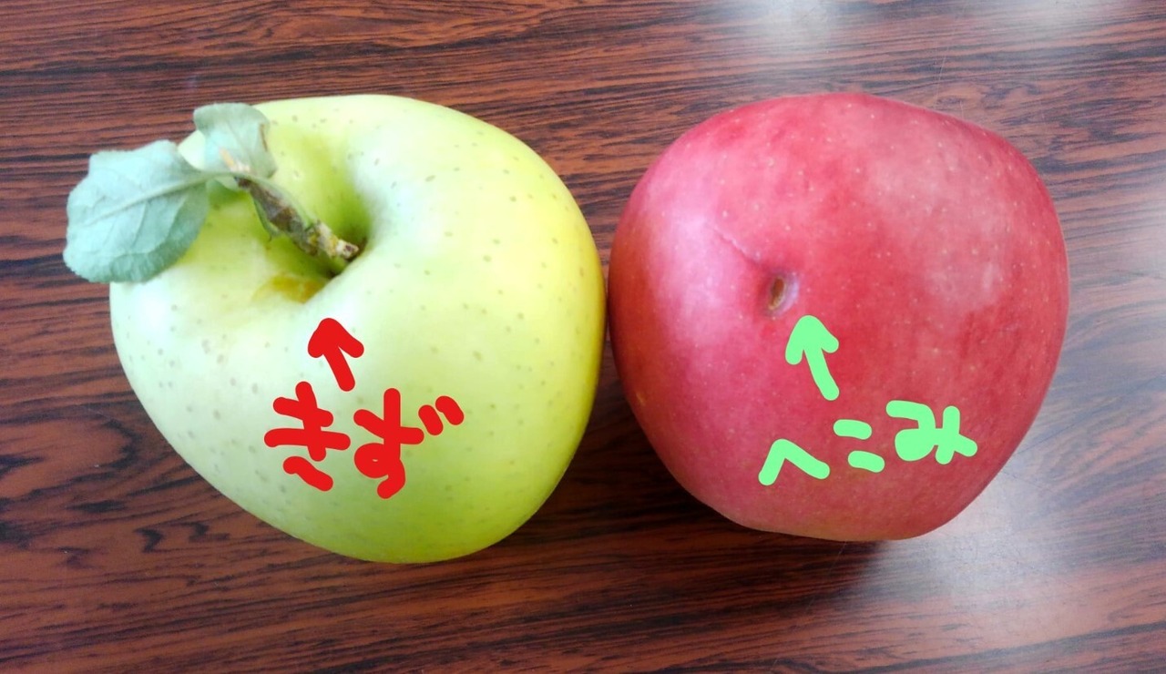 ・軟化が始まっているもの、深い枝傷や色ムラ、凹凸あるりんごです。